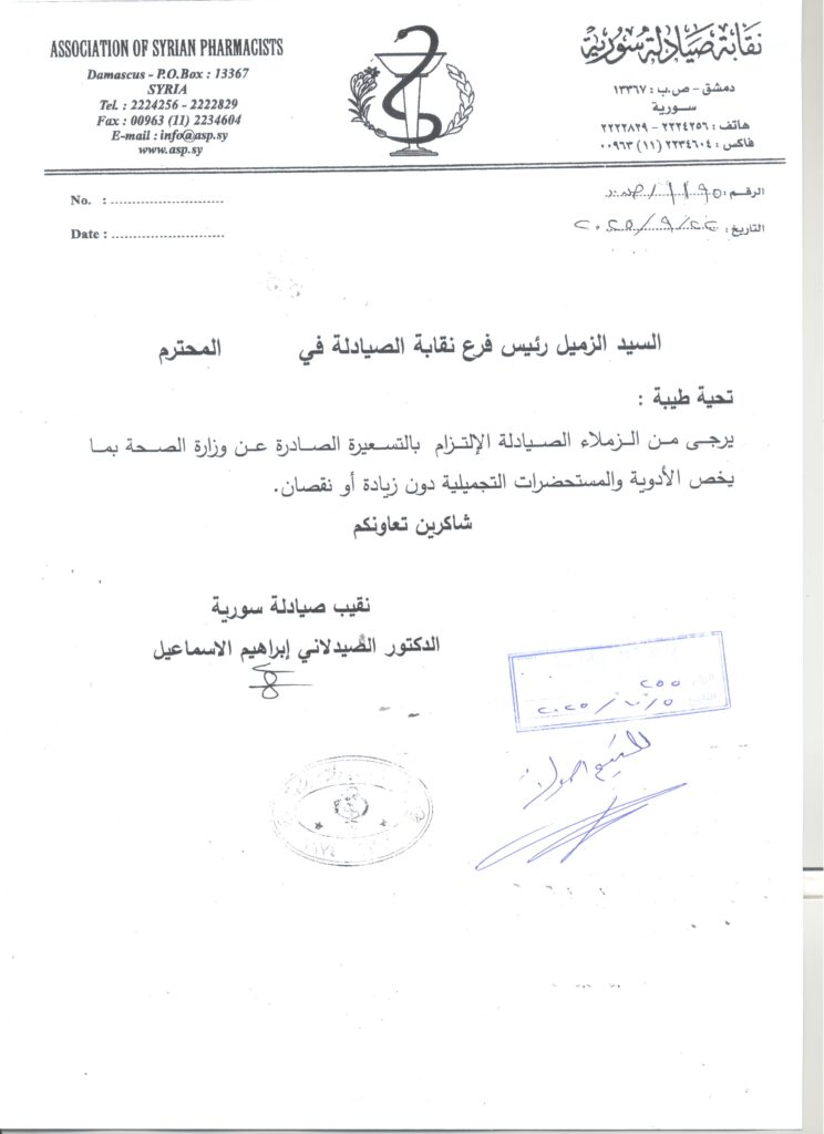 تعميم من النقابة المركزية بخصوص الالتزام بتسعيرة المستحضرات والادوية التجميلية